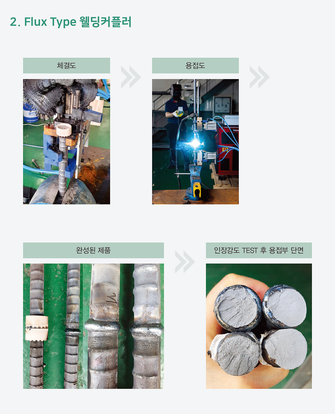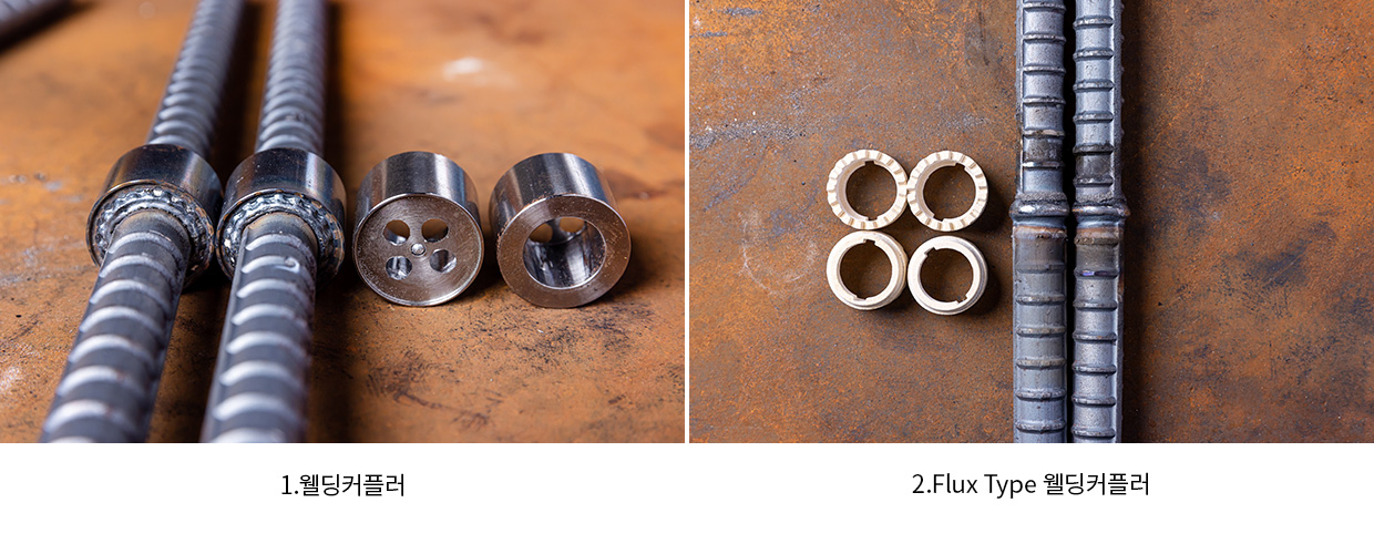 내진 성능을 지닌 철근 연결 커플러 ① 발명특허 : 제 10-1906921호 철근 융접합 타입 커플러 철근 양끝단부를 3~4mm 녹여서 쇳물과 쇳물을 접합시키는 융접합 방법이다. ② 발명특허 : 제 10-2022-088475호 Flux를 이용한 융접합 타입 커플러 |