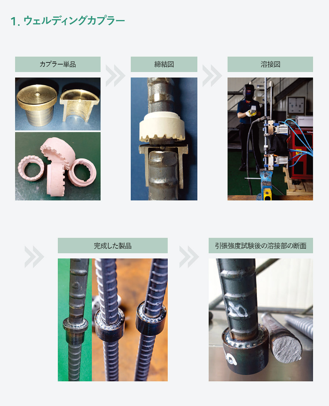 フラックスタイプのウェルディングカプラーは、上記のウェルディングカプラーとほぼ同じ形式であるが、気泡を「0」にさせるために不活性ガスを使用せず、当社が開発したフラックスをセラミックカプラーに充填して自動溶接治具で溶接すると、気泡「0」の断面と引張強度720~780N/mm2の鉄筋連結製品を具現することができる新工法である、 |